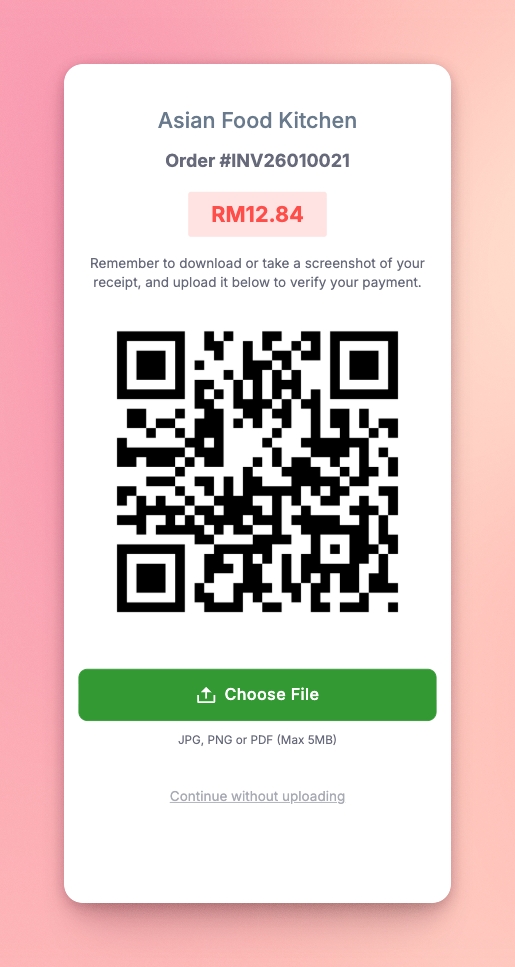 For QR code payments, customers can upload a screenshot or photo of their payment proof on the same payscreen where they see the QR code.